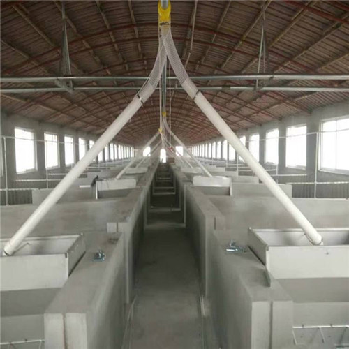 豬用料線是我公司為豬場開辟一款產物,在三相交換電念頭的動員下,刮板式鏈條經由過程管道,將飼料從料罐掛到豬舍。料線管道從豬只采食的食槽下面顛末,在每-個食槽地位,留有一個三通下料口。飼料在鏈條的動員下,主動的流入食槽中。本體系能夠利用到育肥豬舍、定位欄、母豬精確飼喂、種豬測定裝備。